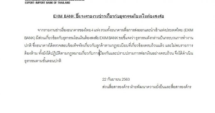 EXIM BANK ยืนยันไม่พบรายการโอนเงินต้องห้าม และปฏิบัติตามกฎหมาย ปปง.
