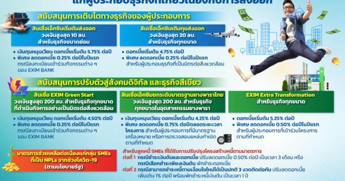 EXIM BANK ขานรับคลัง บรรเทาภาระดอกเบี้ย กลุ่ม SMEs เริ่มต้นหรือขยายธุรกิจส่งออก คิดดอกเบี้ยเริ่มต้น 5.75% ต่อปี ร่วมทุกกิจกรรมลดดอกเบี้ยพิเศษ 0.25% ต่อปี