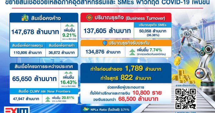 EXIM BANK แถลงผลการดำเนินงานครึ่งแรกปี 2564 ช่วยเหลือผู้ประกอบการทั้งด้านการให้คำปรึกษาและบริการทางการเงินในวิกฤตโควิด-19 ได้ 9,400 ราย วงเงินรวมกว่า 67,000 ล้านบาท ยอดสินเชื่อคงค้าง 137,409 ล้านบาท เพิ่มขึ้น 8.62% จากปีก่อน