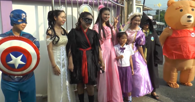 Teachers and staff of a school in the central province of Nakhon Pathom give a warm “back to school” welcome to their students in superhero and fancy costumes.