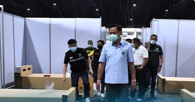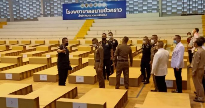 Ye Yan Aung, labor attaché at the Myanmar embassy in Bangkok, visited the compound of the Wattana Factory project in Phan Thai Norasing sub-district of Muang district, Samut Sakhon, to inspect the construction of a 1,000-bed field hospital to treat COVID-19 patients.
