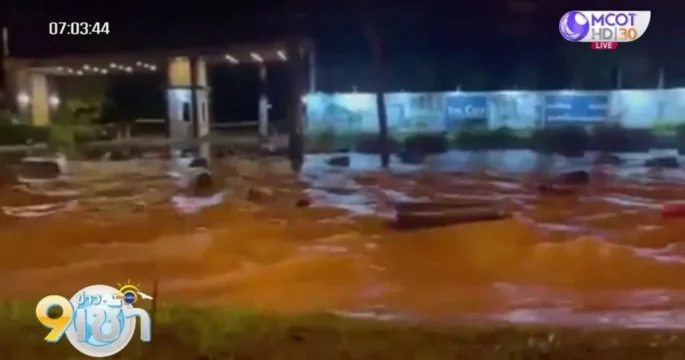 Forest runoff from Doi Inthanon Mountain triggered by heavy rain has inundated downstream communities, affecting over 100 houses and agricultural plots in Chiang Mai.