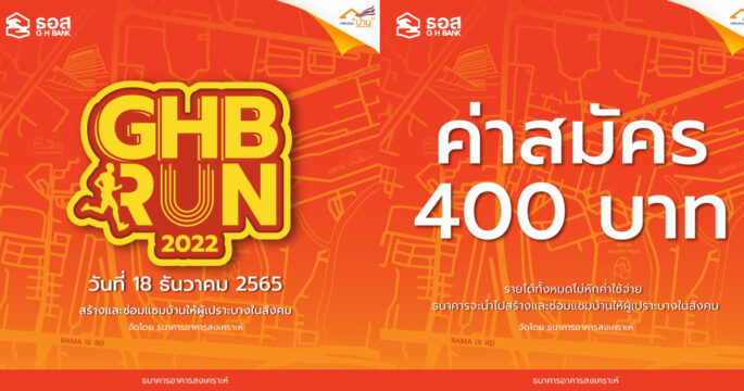 ธอส. ชวนร่วมงานเดิน-วิ่ง GHB RUN 2022 ชิงเงินรางวัลรวมถึง 3.4 แสนบาท รายได้จากค่าสมัครนำไปสร้างและซ่อมบ้านให้ผู้เปราะบางในสังคม