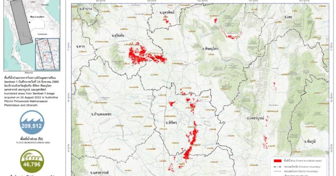 GISTDA เปิดเผยภาพจากดาวเทียม พบพื้นที่น้ำท่วมขังใน จ.สุโขทัย และพิษณุโลก รวมกว่า 9 หมื่นไร่ พื้นที่ปลูกข้าวได้รับผลกระทบแล้วกว่า 3 หมื่นไร่