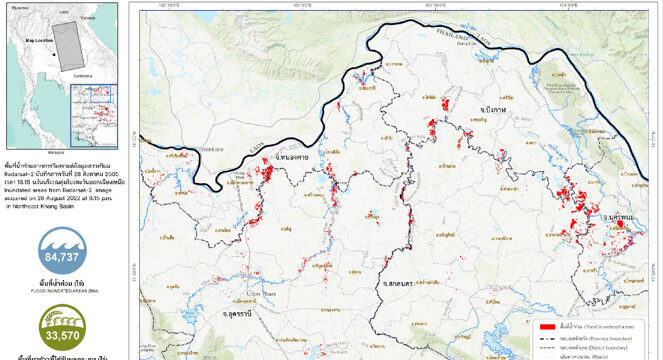 GISTDA เผยข้อมูลจากดาวเทียม พบน้ำท่วมขังในพื้นที่บางส่วนของลุ่มน้ำชี ลุ่มน้ำมูล และลุ่มน้ำโขงตะวันออกเฉียงเหนือ รวมทั้งสิ้น 224,094 ไร่