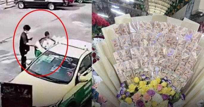 The police summon a Grab taxi driver to acknowledge theft charges after he made off with a 50,000 –baht cash bouquet a woman had ordered for her boyfriend on the commencement day.