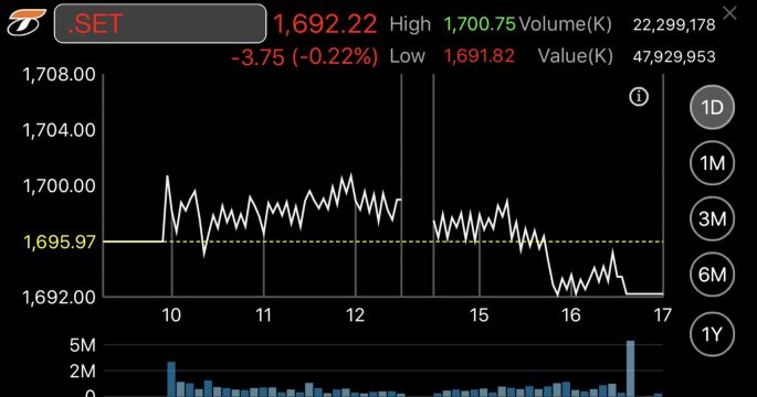 หุ้นไทยลดลงกว่า 3 จุด แรงขายทำกำไรหลังทดสอบ 1,700 จุด มีแรงซื้อกลุ่มการบินหนุนตลาด หลังไอเคโอปลดธงแดง