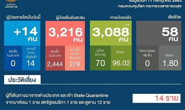 Thailand logged 14 new cases of coronavirus disease 2019 patients who were quarantined returnees.