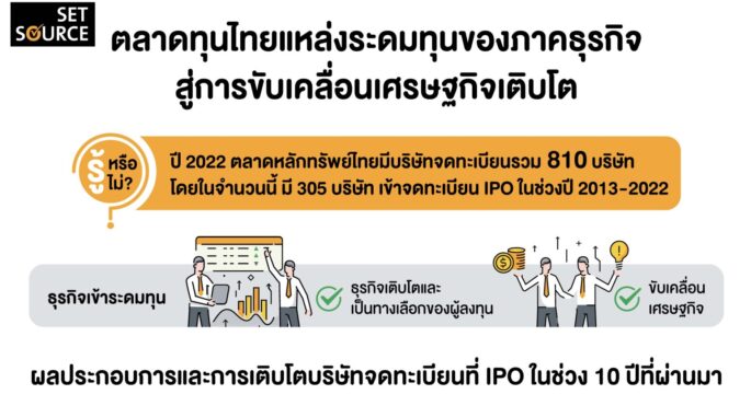 กรุงเทพฯ 3 ก.ค.- ตลาดหลักทรัพย์แห่งประเทศไทย เผย  10 ปี (2013-2022 ) มี 305 บริษัทกระจายหุ้น   โดย  market cap   พบประมาณครึ่งหนึ่งของ บจ. ที่ IPO ในตลาด SET และประมาณ 70% ในตลาด mai เติบโตได้ดีหลังเข้าจดทะเบียน ข้อมูล SET NOTE  ระบุว่าในช่วงปี 2013 – 2022 มีบริษัทเข้าจดทะเบียน IPO ในตลาดหลักทรัพย์ไทยทั้งหมด 305 บริษัท แบ่งเป็นบริษัทที่ IPO ในตลาด SET และ mai ในสัดส่วนที่ใกล้เคียงกัน และมีการกระจายตัวในเชิงกลุ่มอุตสาหกรรมที่หลากหลาย  ในด้านผลประกอบการช่วง 3 ปีหลังเข้า IPO พบว่าเติบโตดี โดย 40-50% ของบริษัทจดทะเบียน (บจ.) ที่ IPO มีผลกำไรเฉลี่ยเติบโตมากกว่า 20% ต่อปี และ 65% มีผลกำไรเฉลี่ยเติบโตทุกปี ซึ่ง บจ. ในกลุ่ม Financials และResources โดดเด่นที่สุด อนึ่งมี 25 บริษัท หรือคิดเป็นเพียง 8% ของ บจ. IPO ทั้งหมด ที่มีผลประกอบการรวมขาดทุนในช่วง 3 ปีหลังเข้า IPO สำหรับการเติบโตของรายได้ พบว่า บจ. มีรายได้ช่วง 3 ปีหลัง IPO เติบโตดีเช่นกัน โดยประมาณ 30% ของ บจ. ที่IPO มีรายได้เฉลี่ยเติบโตมากกว่า 20% ต่อปี และเกือบ 80% มีรายได้เฉลี่ยเติบโตทุกปี โดยพบว่ากลุ่ม Financials โดดเด่นที่สุด ด้านการเติบโตของมูลค่าหลักทรัพย์ตามราคาตลาด (market cap) พบประมาณครึ่งหนึ่งของ บจ. ที่ IPO ในตลาดSET และประมาณ 70% ในตลาด mai เติบโตได้ดีหลังเข้าจดทะเบียน อีกทั้ง ยังพบ 21 บริษัทที่เติบโตจนได้ย้ายจากตลาด mai ไปที่ SET หรือคิดเป็น 14% ของ บจ. ที่เข้า IPO ในตลาด mai ทั้งหมด ซึ่งเป็นที่น่าสังเกตว่า เกินครึ่งหนึ่งของ บจ. เหล่านี้ใช้เวลาเพียงไม่เกิน 3 ปีเพื่อที่จะเติบโตและได้ย้ายตลาด โดยส่วนใหญ่เป็นบริษัทที่อยู่ในกลุ่มResources และ Services .-สำนักข่าวไทย
