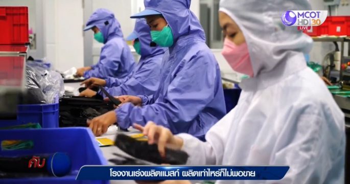 ในสถานการณ์โคโรนาไวรัส ทำให้หน้ากากอนามัย กลายเป็นสินค้าที่ต้องการของผู้คนจำนวนมาก เพราะเป็นสิ่งที่ช่วยป้องกันที่ดีที่สุดอย่างหนึ่ง ไม่ให้ติดเชื้อโรคที่กำลังเป็นที่หวาดกลัว วันนี้สำนักข่าวไทย พาไปดูการผลิตหน้ากากอนามัยที่โรงงานแห่งหนึ่ง ซึ่งจากที่เคยตั้งเป้าจะผลิตส่งตลาดอาเซียน แต่วันนี้ เน้นผลิตให้เพียงพอในประเทศก่อน
