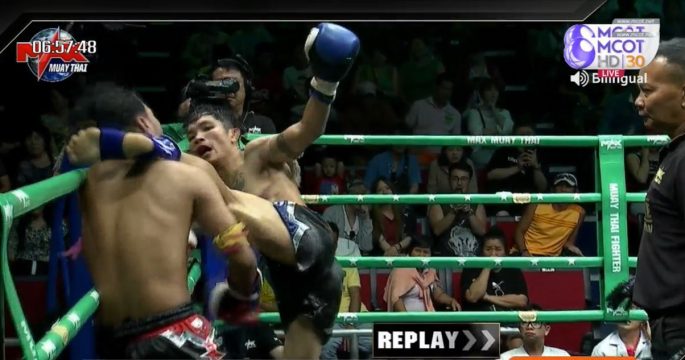 ยักษ์เล็ก ศิริสุขยิม จากสกลนคร มุมน้ำเงิน เตะก้านคอ ป๊อปอาย สิงหเดชายิม แชมป์มวยรอบแม็กซ์มวยไทย จากบุรีรัมย์ ลงไปน็อกยก 2 ศึกแม็กซ์มวยไทย