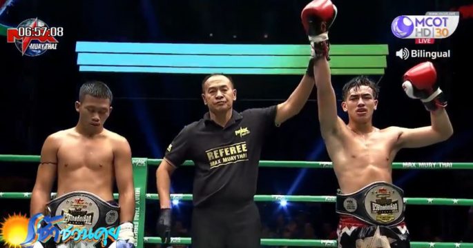 ผลแม็กซ์มวยไทยเย็นวานนี้ (12 ก.ย.) รุ่น 65 กก. เด็กระเบิด ลูกอ่างตานนท์ ชนะน็อก เพชรภาคิน ส.สิรินทรา กระชากเข็มขัดแชมป์มาครองได้สำเร็จ