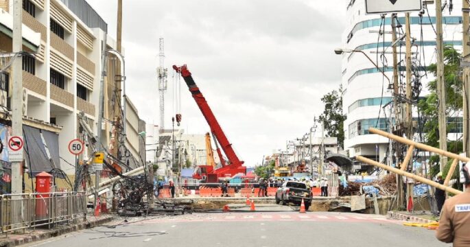 MEA เร่งฟื้นฟูระบบไฟฟ้า-กู้เสาไฟล้มจากเหตุถนนทรุด