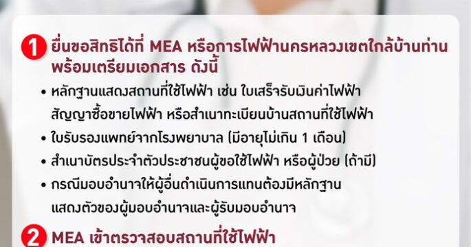 MEA แจ้งขั้นตอนการยกเว้นตัดกระแสไฟฟ้าบ้านผู้ป่วยที่ใช้ไฟฟ้าในการเดินเครื่องมือทางการแพทย์เพื่อการรักษาพยาบาล (ผู้ป่วยติดเตียง)
