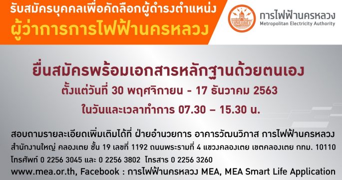 MEA เปิดรับสมัครบุคคลเพื่อคัดเลือกผู้ดำรงตำแหน่งผู้ว่าการการไฟฟ้านครหลวง ยื่นสมัครพร้อมเอกสารหลักฐานด้วยตนเอง ตั้งแต่วันที่ 30 พฤศจิกายน – 17 ธันวาคม 2563 ในวันและเวลาทำการ