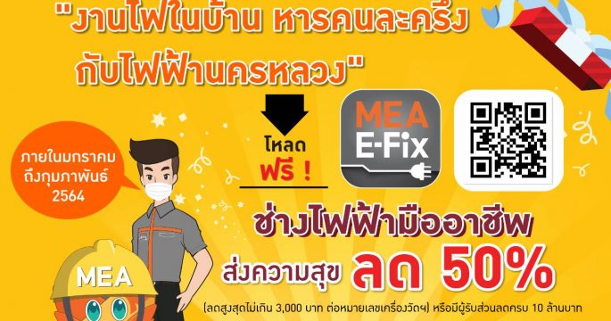 MEA เปิดตัวแอปพลิเคชั่น MEA e-Fix วันแรก เพื่อบริการติดตั้งอุปกรณ์ไฟฟ้าจากช่างมืออาชีพ พร้อมแจกโปรโมชั่นล้างแอร์ฟรี 100 ท่านแรก