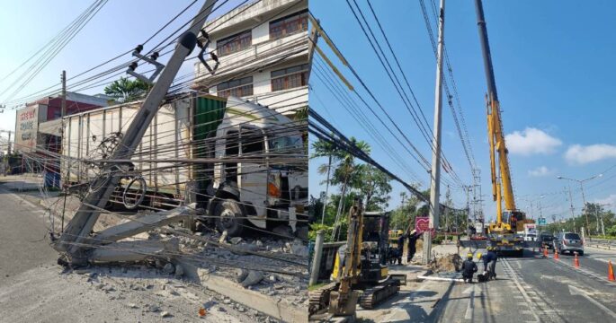 MEA ระดมเจ้าหน้าที่แก้ไขเหตุรถบรรทุกชนเสาไฟฟ้าล้ม บริเวณซอยเทศบาลบางปู 58 สมุทรปราการ