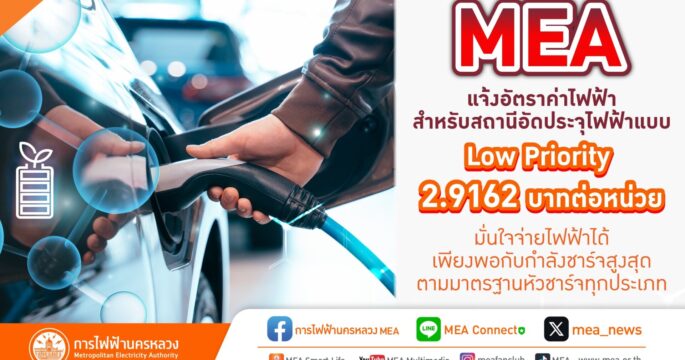 กรุงเทพฯ 28 ก.พ.- MEA หรือ การไฟฟ้านครหลวง แจ้งอัตราค่าพลังงานไฟฟ้าสำหรับสถานีอัดประจุไฟฟ้าสาธารณะแบบ Low Priority ที่ 2.9162 บาทต่อหน่วย (ไม่รวมภาษีมูลค่าเพิ่ม ตามมติ กกพ. เมื่อวันที่ 10 พฤษภาคม 2566) โดยยกเว้นค่าความต้องการพลังไฟฟ้า (Demand Charge)
