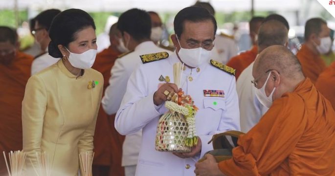 Prime Minister Prayut Chan-o-cha led cabinet ministers to give alms of Buddhist monks to make merits for His Majesty the King on the King’s birthday.