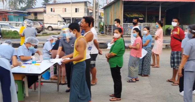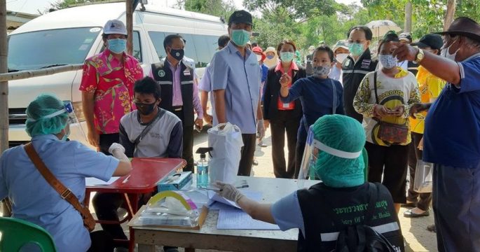 Thai health officials conduct a random testing of 2,100 migrant workers in Samut Sakhon province for COVID-19 in an attempt to contain the outbreak.