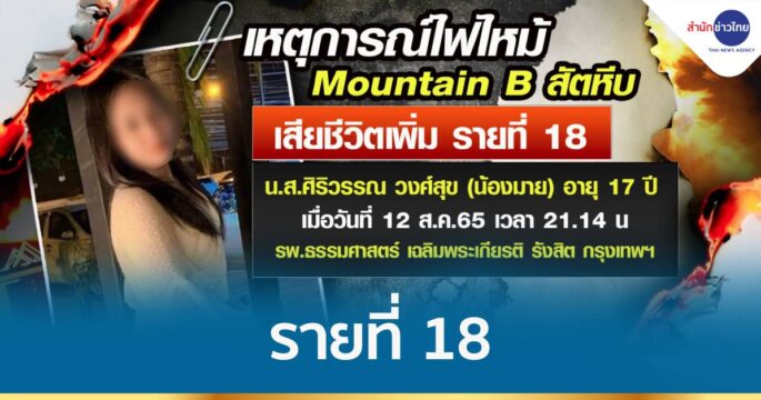 “น้องมาย” อายุ 17 ปี เหยื่อไฟไหม้ Mountain B เสียชีวิตอีก 1 ราย ทำให้ยอดผู้เสียชีวิตเหตุการณ์นี้พุ่งเป็น 18 ราย