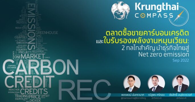 ศูนย์วิจัย Krungthai COMPASS ชี้ธุรกิจแนวหน้าด้าน ESG ใช้การซื้อขายคาร์บอนเครดิตและใบรับรองพลังงานหมุนเวียน เป็นเครื่องมือสำคัญในการก้าวสู่ Net Zero Emission และเป้าหมายการใช้พลังงานหมุนเวียน 100% คาดแนวโน้มตลาดโลกและไทยเติบโตสูง แนะผู้ประกอบการเร่งเตรียมความพร้อม ส่วนภาครัฐควรมีมาตรการส่งเสริมอย่างต่อเนื่อง