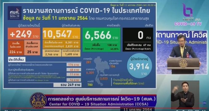 Thailand logged 249 new COVID-19 cases, raising the total to 10,547, according to the COVID-19 Information Center.