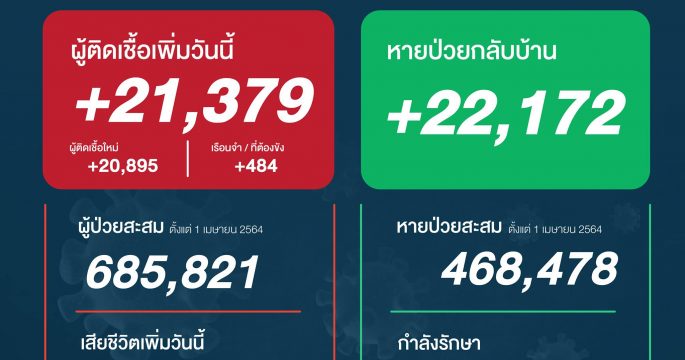 Thailand reported on Friday 21,379 coronavirus cases and 191 more deaths, the data from the Center for Covid-19 Situation Administration showed.