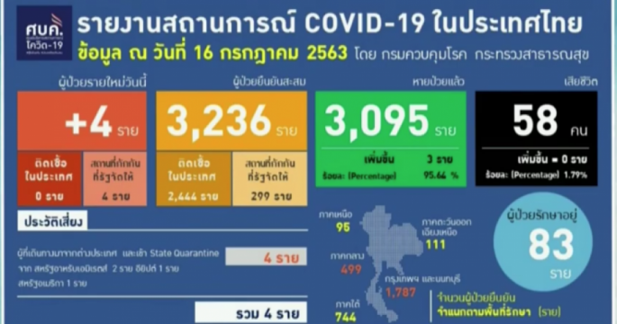 Thailand reported four new imported cases of Covid-19, raising the total cases in the country to 3,236.