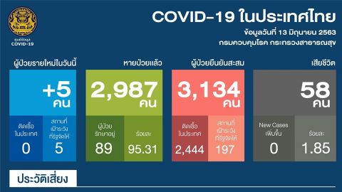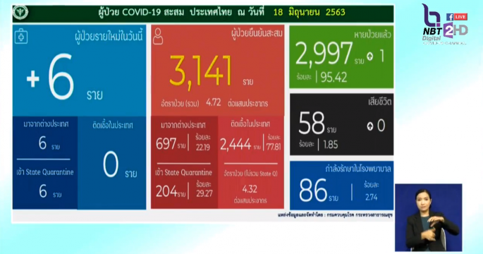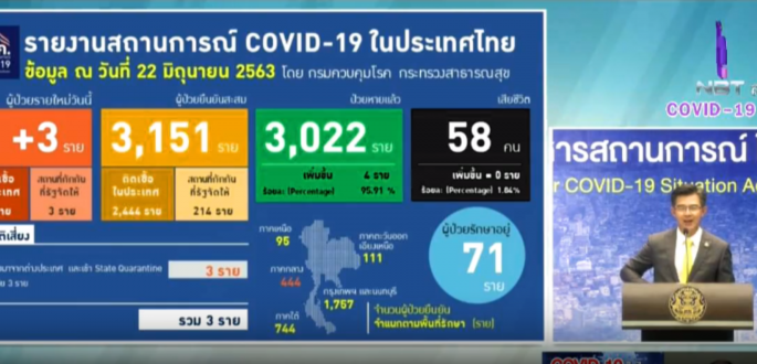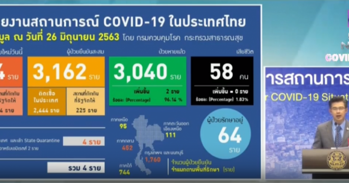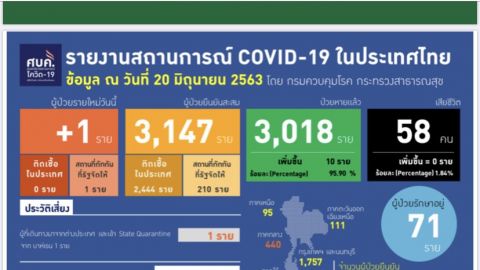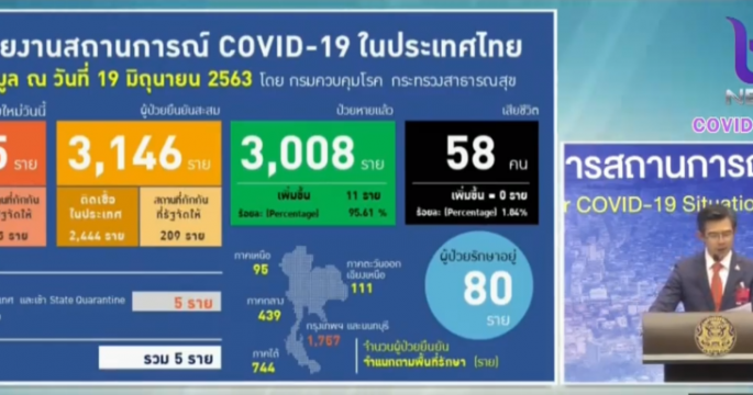 BANGKOK, June 18 (TNA) – Thailand reported six new Covid-19 cases, raising the total cases to 3,141 and no new deaths. The recovery cases totaled 2,997 and 86 coronavirus patients are being treated at hospitals. The death toll remains at 58. Panprapa Yongtrakul, spokeswoman for the Centre for Covid-19 Situation Administration said all of the […]