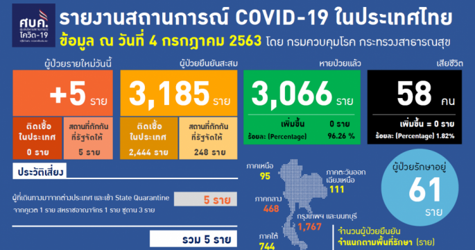 Thailand reported four new imported cases of Covid-19, raising the total cases to 3,162.