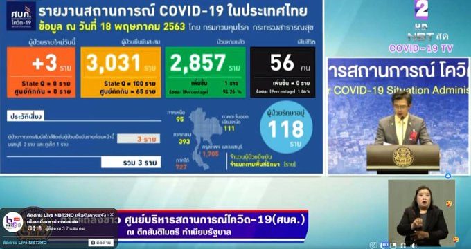 Thailand reported three new Covid-19 cases, raising the total cases to 3,031 while the death toll remains at 56.
