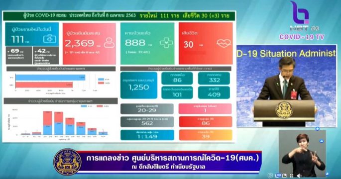 Thailand reports 111 new Covid-19 infections, bringing the total to 2,369 with three more deaths, raising the toll to 30.