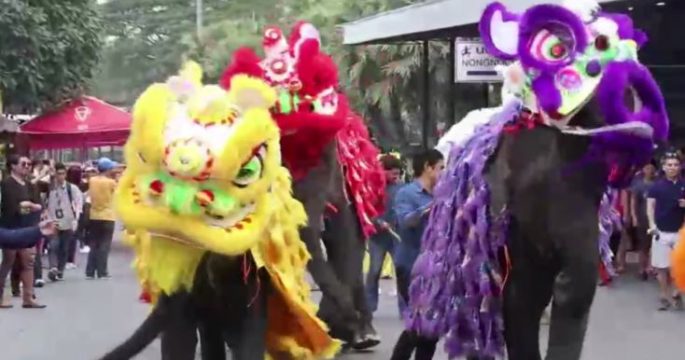 Elephants perform lion dance in festive Chinese New Year celebration at a botanical park in Thailand’s Chon Buri province.