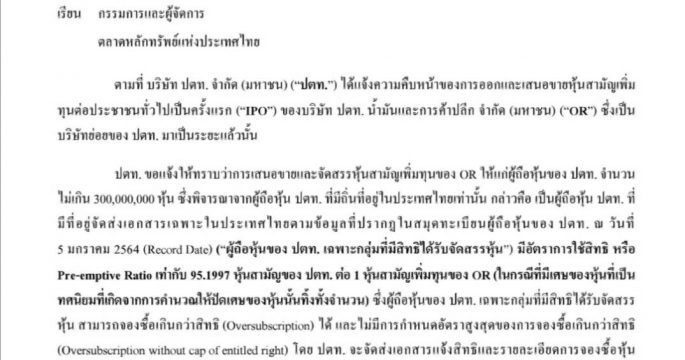 หุ้น OR เปิดรายย่อยจองเริ่ม 24 ม.ค. – 2 ก.พ. ส่วนผู้มีสิทธิที่เป็นผู้ถือหุ้น ปตท.จอง 25 – 28 ม.ค. ช่วงราคา IPO 16 – 18 บาท/หุ้น เคาะราคา 3 ก.พ.