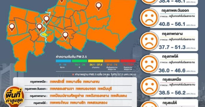 กรุงเทพฯ 5 ม.ค.- GISTDA รายงานสถานการณ์ฝุ่น PM 2.5 เช้านี้ โดยพบเกินค่ามาตรฐาน 26 จังหวัด ขณะที่กทม. และปริมณฑลเกินค่ามาตรฐานถึง 48 เขต โดยอีก 2 เขตอยู่ในเกณฑ์ปานกลาง สำนักงานพัฒนาเทคโนโลยีอวกาศและภูมิสารสนเทศ (องค์การมหาชน) หรือ GISTDA รายงานสถานการณ์ฝุ่น PM 2.5 จากดาวเทียมผ่านแอปพลิเคชั่น “เช็คฝุ่น” เมื่อเวลา 9.00 น. ของวันที่ 5 มกราคม 2567 พบว่า เกินค่ามาตรฐาน 26 จังหวัด โดย 3 จังหวัดที่มีค่าเกินเกณฑ์มาตรฐานในระดับที่มีผลกระทบต่อสุขภาพสีแดงคือ สมุทรสงคราม 102.7 ไมโครกรัม สมุทรสาคร 101.7 ไมโครกรัม นครปฐม 78.7 ไมโครกรัม ส่วนอีก 23 จังหวัดมีค่าเกินเกณฑ์มาตรฐานในระดับที่เริ่มมีผลกระทบต่อสุขภาพสีส้ม โดย 5 […]