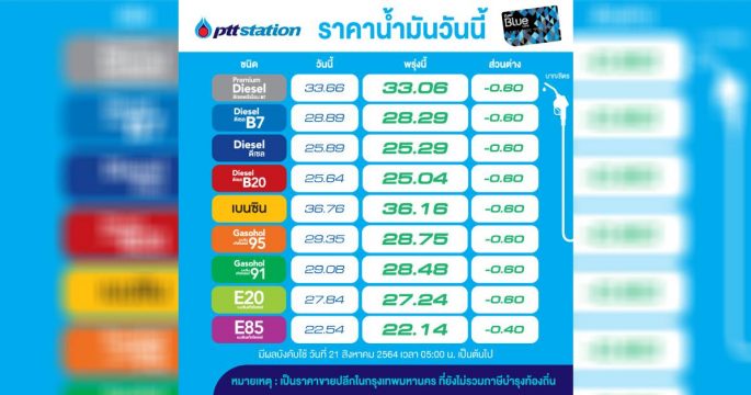 PTT Station ปรับลดราคาขายปลีกน้ำมันทุกชนิดลง 0.60 บาทต่อลิตร เว้น E85 ลดลง 0.40 บาทต่อลิตร มีผล 21 ส.ค.64 เวลา 05.00 น. เป็นต้นไป โดยราคาขายปลีกจะเป็นดังนี้