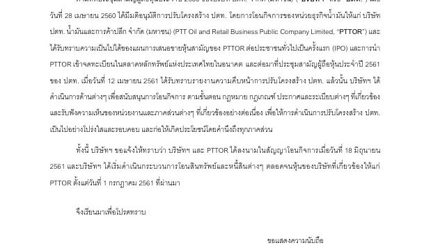 PTT แจ้ง ตลท. เริ่มโอนทรัพย์สิน-หนี้สินให้ PTTOR ตั้งแต่ 1 ก.ค.61 ยืนยันโปร่งใส