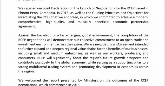 ที่ประชุม RCEP ออกแถลงการณ์ร่วม ยอมรับ อินเดีย ไม่ร่วมข้อตกลงเจรจาทางการค้า เนื่องจากยังมีปัญหาที่ยังไม่ได้รับการแก้ไข และเห็นว่า การไม่เข้าร่วมอาจเป็นประโยชน์มากกว่า