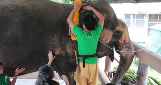 Landmine victim elephant named Motala receives blessings in a traditional ritual on the 20th anniversary of her ordeal at an elephant hospital in northern Thailand.
