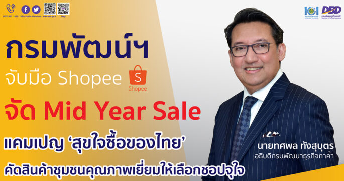 อธิบดีกรมพัฒนาธุรกิจการค้าเผยร่วมกับ Shopee จัดโปรโมชั่นส่งเสริมการขายลดราคากลางปี (Mid Year Sale) คัดสินค้าชุมชนคุณภาพเยี่ยมให้เลือกชอปจุใจกว่า 400 ร้านค้า สินค้ากว่า 4,000 รายการ พร้อมมอบโค้ดส่วนลด 15% เพียงกรอก Code “DBD15” ตั้งแต่วันนี้จนถึง 15 พ.ค.นี้ คาดสร้างรายได้รวมทั้งแคมเปญไม่น้อยกว่า 90 ล้านบาท