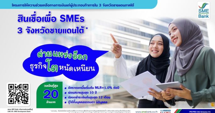 กรุงเทพฯ 13 มิ.ย. -“SME D Bank” หนุน SMEs 3 จังหวัดชายแดนใต้ ด้วยสินเชื่อพิเศษ วงเงินกู้สูง 20 ล้านบาทต่อราย ผ่อนสบาย ดันขยายลงทุนสู่พื้นที่มีศักยภาพ