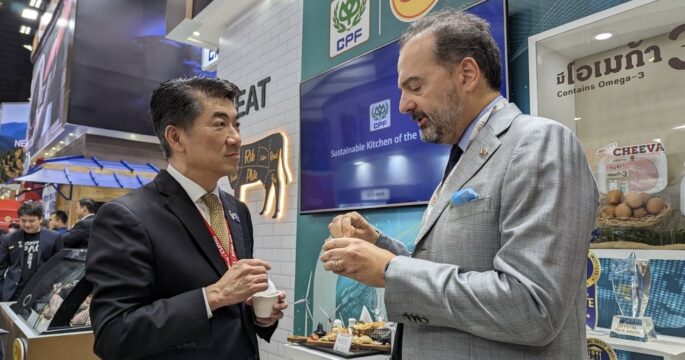 นนทบุรี 30 พ.ค.-คณะทูตนานาประเทศ คู่ค้า และผู้นำหน่วยงานภาครัฐและเอกชน เยี่ยมชมและชื่นชอบบูธ ของ บริษัท เจริญโภคภัณฑ์อาหาร จำกัด (มหาชน) หรือ ซีพีเอฟ ร่วมแสดง ในงาน THAIFEX-ANUGA ASIA 2024 แนวคิด ครัวของโลกด้วยนวัตกรรมความยั่งยืน หรือ “Kitchen of the world with Sustainovation” ด้านนวัตกรรมอาหาร ตอบเทรนด์โลกทั้งด้านการส่งเสริมสุขภาพที่ดี รสชาติอร่อย พร้อมรับผิดชอบต่อสังคมและใส่ใจสิ่งแวดล้อม ส่งออก Soft Power อาหารไทยสู่ผู้บริโภคทั่วโลก