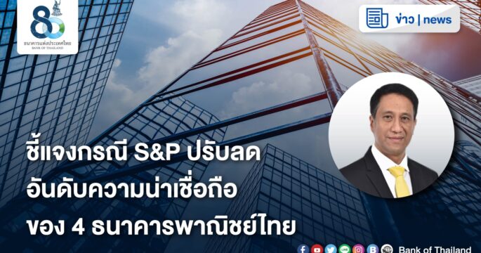 ธปท.ชี้แจงกรณี S&P ปรับลดอันดับความน่าเชื่อถือของ 4 ธนาคารพาณิชย์ไทย ยืนยันฐานะการเงินของระบบธนาคารพาณิชย์ไทยยังแข็งแกร่ง เพียงพอที่จะรองรับความเสี่ยงจากความไม่แน่นอนสูงในอนาคต