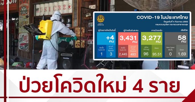 สถานการณ์การติดเชื้อ COVID-19 ประเทศไทย พบผู้ป่วยรายใหม่ 4 ราย ผู้ป่วยยืนยันสะสม 3,431 ราย หายป่วยแล้ว 3,277 ราย เสียชีวิตสะสม 58 ราย