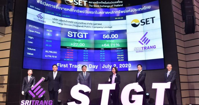 บมจ. ศรีตรังโกลฟส์ (ประเทศไทย) หรือ STGT เข้าเทรดวันแรกในตลาดหลักทรัพย์แห่งประเทศไทย ราคาร้อนแรงพุ่งกระฉูด 62.50 % จากราคา IPO ที่ 34 บาท