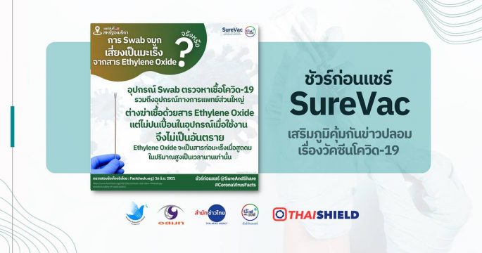 อุปกรณ์ Swab ตรวจหาเชื้อโควิด 19 รวมถึงอุปกรณ์ทางการแพทย์ส่วนใหญ่ ต่างฆ่าเชื้อด้วยสาร Ethylene Oxide แต่ไม่ปนเปื้อนในอุปกรณ์เมื่อใช้งานจึงไม่เป็นอันตราย