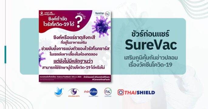 ซิงค์หรือแร่ธาติสังกะสีที่อยู่ในอาหารเสริม ช่วยยับยั้งการแบ่งตัวของไวรัสโรคซาร์สในเซลล์เพาะเลี้ยงในห้องทดลอง แต่ยังไม่มีหลักฐานว่าสามารถใช้รักษาผู้ป่วยโควิด-19 ได้หรือไม่