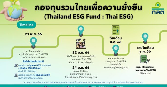 ผู้บริหาร ก.ล.ต.-ตลาดทุน เชิญชวนคนรุ่นใหม่ ซื้อหน่วยลงทุนออมเงินระยะยาว กองทุน Thailand ESG Fund สูงสุด 100,000 บาท ลดหย่อนภาษีปี 66 ถึง 30% เริ่มขายแล้ววันนี้ ชี้ถือเป็นก้าวแรกที่ประเทศไทยมีกองทุน ESG หลังเคยศึกษามาหลายปี มั่นใจจะร่วมมือทุกฝ่ายให้ไทยเป็นผู้นำกองทุน ESG ระดับโลกได้