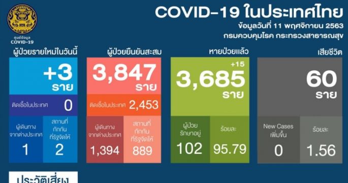 Thailand logged three new cases of the novel coronavirus comprising two quarantined arrivals and one detected at a health screening checkpoint, reported the Center for COVID-19 Situation Administration (CCSA).
